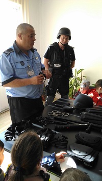 Şeful Biroului Ordine Publică - Constantin Valentin le-a prezentat micuţilor mijloacele de autoapărare din dotarea poliţiştilor locali şi au fost discutate diverse teme preventive de care trebuie să ţină cont.